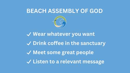 Beach Assembly of God is a place where people can meet Jesus, engage in life-giving community, and everyone is welcome. We believe in creating a space where people can have authentic encounters with Christ, discover their gifts and use them for God's glory. Join us for our Sunday services!